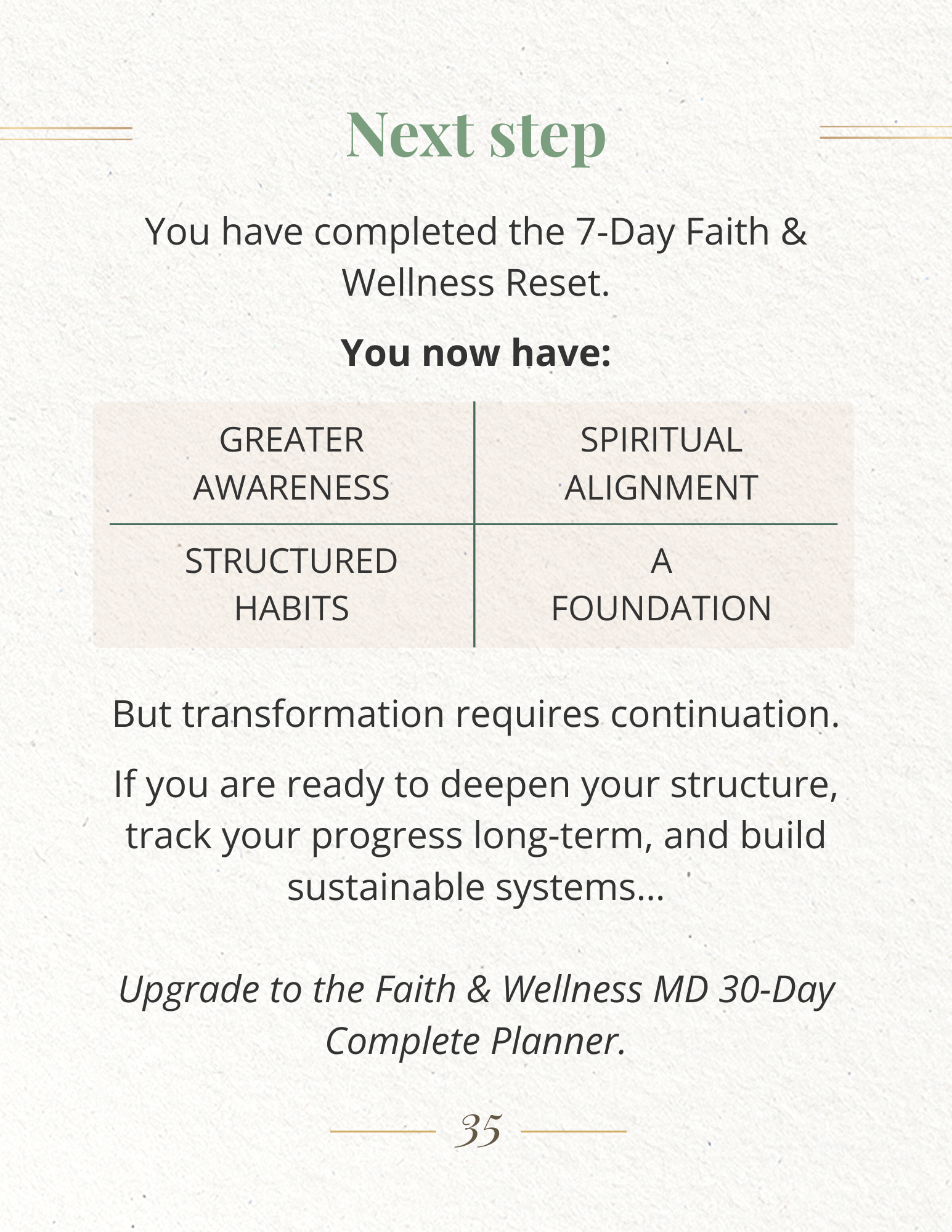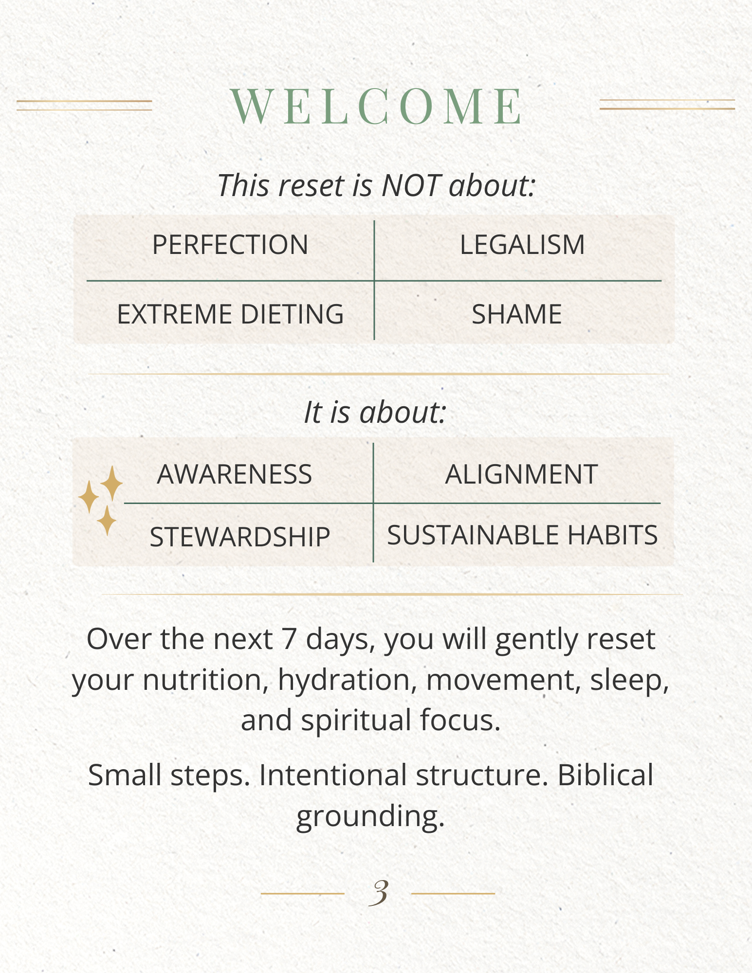 In 7 days, you will gently reset your nutrition, hydration, movement, sleep, and spiritual focus.